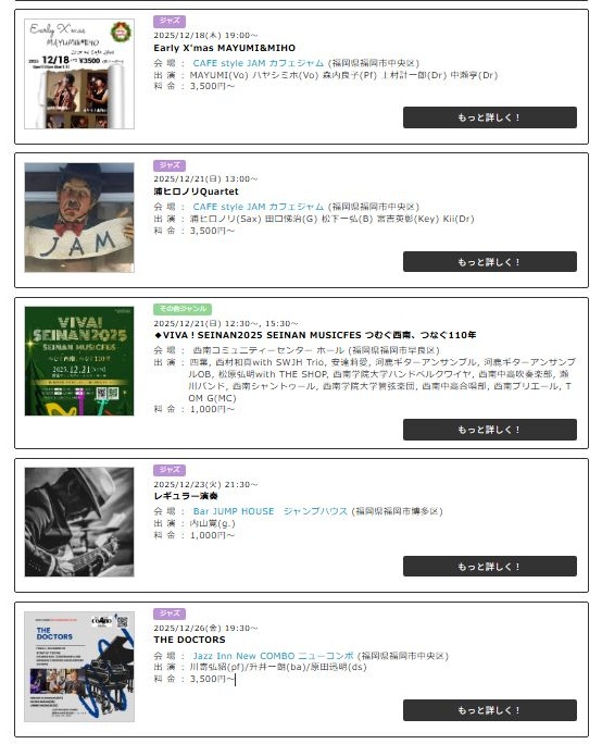 福岡を中心に、ジャズをはじめクラシック・ポップスなど幅広い音楽イベントを検索できるサイトです。
