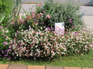 鴻臚館広場では、春らしい花壇が綺麗に整備され、マーガレットが目を引きます。