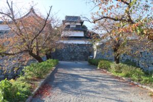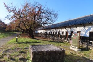 • 多聞櫓前広場では「桜の冬姿」が来春の開花を想像させる