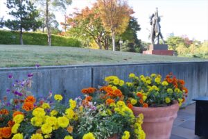 赤・黄のマリーゴールドとオブジェの組み合わせが映えるスポット。