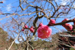 楼門手前、三の鳥居を過ぎた場所では紅梅がすでに開花しており、冬の境内に鮮やかな色を添えていました。
