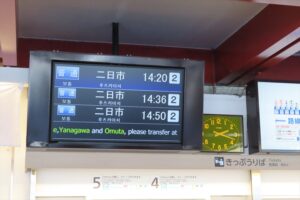 11時02分発の特急大牟田行に乗車し、11時15分に二日市到着。太宰府行きは11時17分発。階段を上がり別ホームへ急ぎますが、結果的に電車は1分ほど待ってくれました。こういう時こそ、慌てないことが大切ですね。