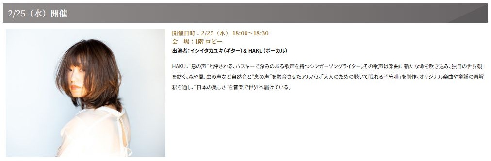 • 形式:毎月第4水曜日開催のチャリティロビーコンサート ※3月のみ特別に「11日」に開催されます。