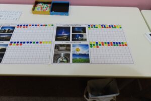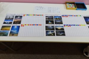 展示会場では次回の個展テーマを選ぶアンケートが行われていました。来場者は A〜Fの6つから“見たい沖縄”を選び、シールを貼ります。