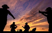 逆光の美学: 黄昏の海岸、古城(グスク)、漁港などに集う人々を、あえて逆光で捉えます。